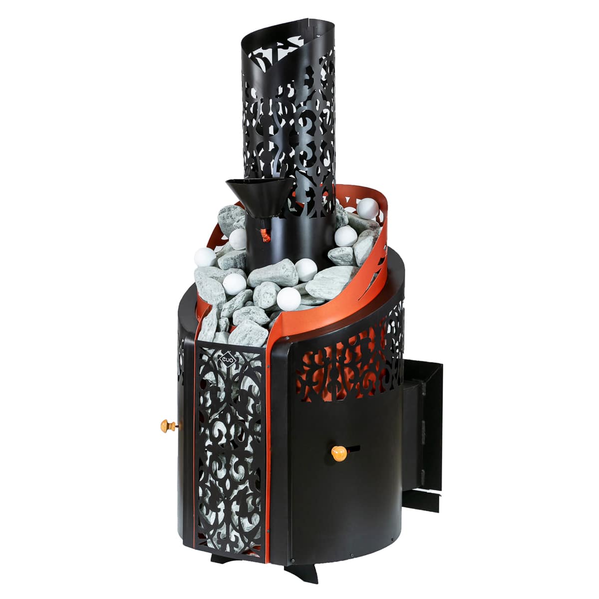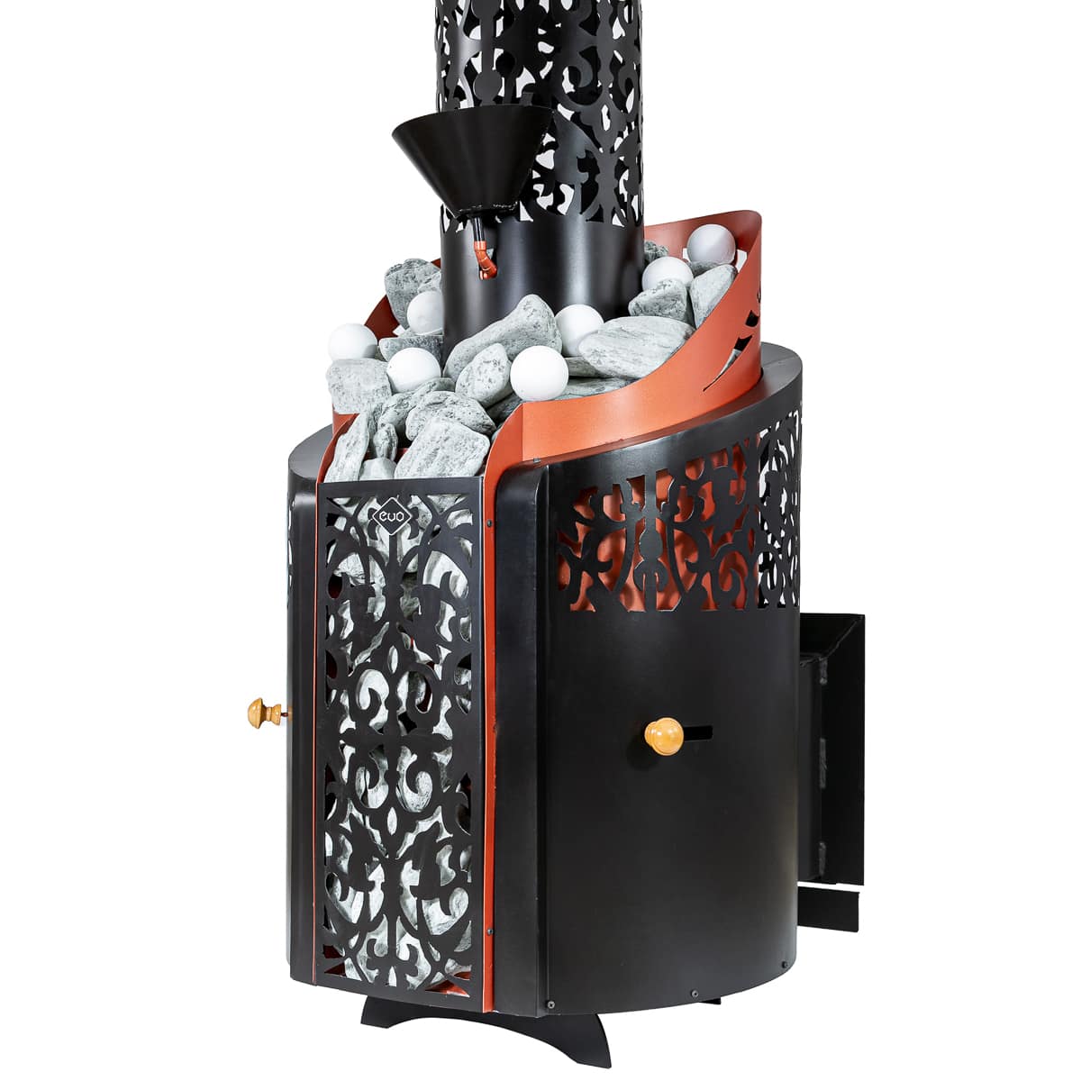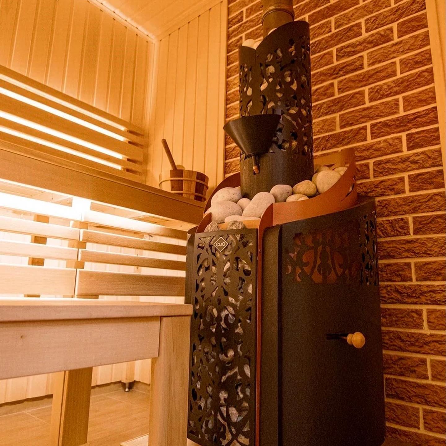 - закрытая каменка вмещает более 100кг камней и нагревает их до температуры свыше 500°, что позволяет испарять рекордное количество воды и получать лёгкий перегретый пар;