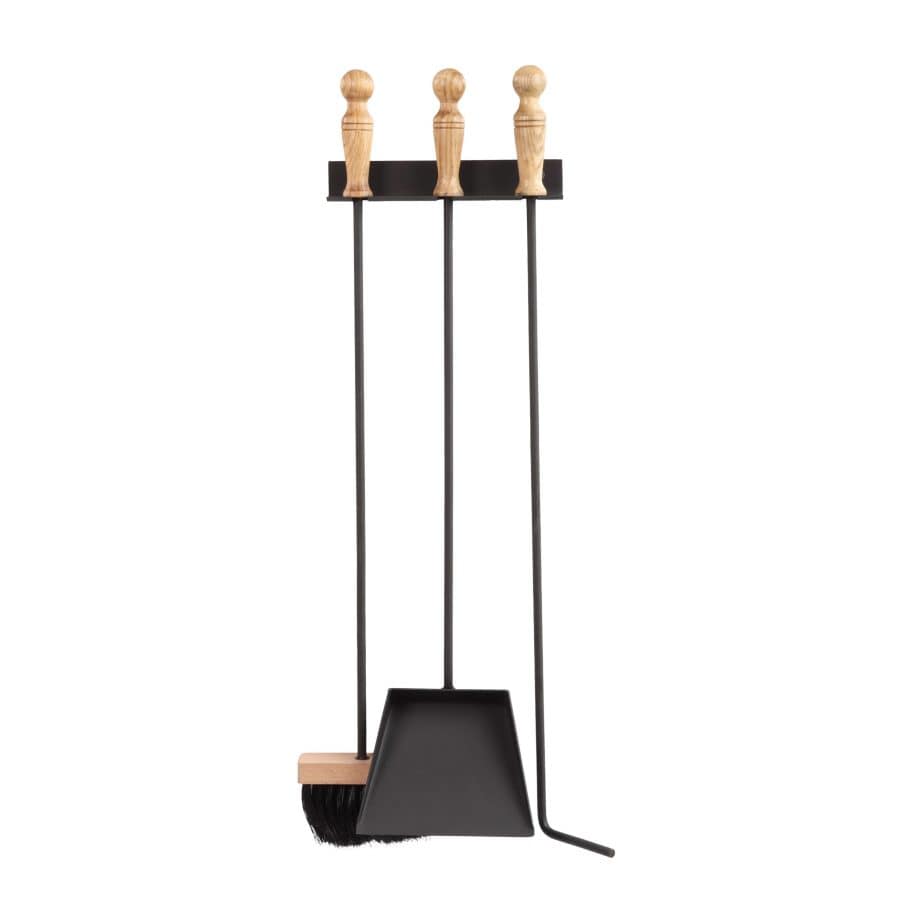 Набор в минималистично стиле предназначен для ухода за пространством возле печи или камина, за топкой печи или камина. Навесной каминный набор сделан из крепкой стали и укомплектован деревянными ручками для комфорта эксплуатации. В набор входят: подвес к стене, кочерга, совок и щётка.