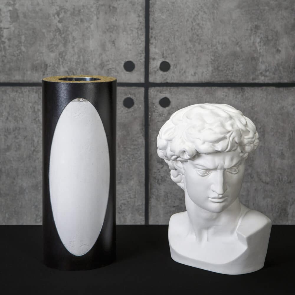 - По конструктивным особенностям труба является утепленной. Между двух контуров нержавеющей стали находится экологичный изоляционный материал Перлит. Вулканический песок белого цвета выдерживает температуру до 1200 градусов, не спекается и не образует пустот внутри между контурами металла. Благодаря перлиту снижается интенсивность образования конденсата, а также повышается срок службы дымоходов системы. На фотографиях демонстрируется белый перлит в элементе трубы под стеклом.